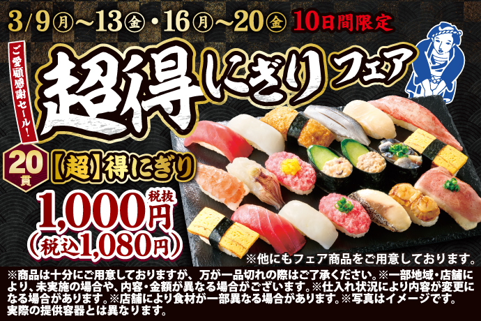 おかげさまで毎回大きなご支持をいただいております小僧寿しの「超得にぎり」!もっとお得に、より良いものに、プレミアムなメニューをご用意しました。3月9日(月)~期間限定『【超】得にぎりフェア』を開催! -