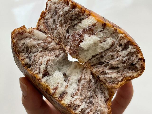 中を割ってみると、外側より中側の方がふわっとした感じがありました。でも軽すぎずしっとり感もあるので、一個でかなりお腹にたまります。