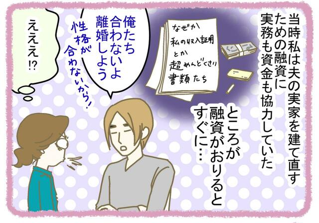 当然、結婚が続くことが前提と思っていたけれど、融資がおりると元夫の態度があまりに冷たく豹変したので、私の精神的にも「そばにいるの無理」という結論に…。