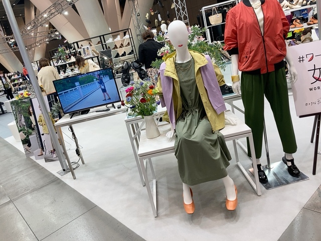 展示会では、カラージャケット、トレーナー、カラーパンプス、ネックレスと合わせたコーデが紹介されていました。