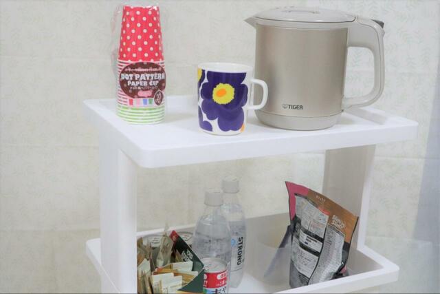 まずは電気ケトルやインスタントコーヒーなどを置いて、ドリンクスタンドにしてみました。