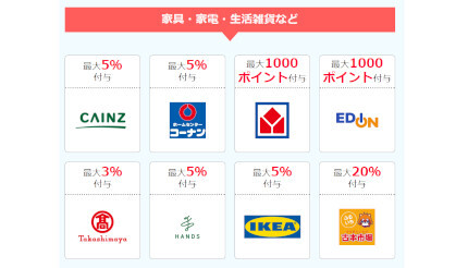 家電量販店カテゴリーでは、エディオン(3万3000円以上の決済でもれなく最大1000ポイント付与)、ヤマダデンキ(同)、マツヤデンキ(同)、でんきち(最大5%付与)、ホームセンター・雑貨店カテゴリーでは、ダイソー(最大5%付与)、カインズ(最大5%付与)、ホームセンターコーナン(最大5%付与)、ハンズ(最大5%付与)、イケア(最大5%付与)、ハンディホームセンター(最大5%付与)といったクーポンを配信中。なお、クーポンの付与総額が所定の金額に達した場合、利用可能期間でも終了する場合がある。