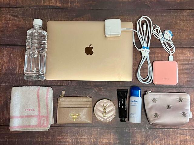 500mlのペットボトル、MacBook Air、充電器、モバイルバッテリー、タオルハンカチ、財布、クッションファンデ、ハンドクリーム、顔用のスプレー、ポーチを楽々収納することができました。
