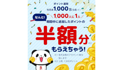 楽天グループは、同社が運営するポイントプログラム「楽天ポイント」を利用して投資体験ができるサービス「ポイント運用 by 楽天PointClub」のユーザー数(楽天ID数の累計)が1000万を突破したことを記念し、「ポイント運用利用者1,000万記念!期間中に追加したポイントの半額分もらえちゃうキャンペーン」「楽天ポイント プレミアムバンク 楽しみ方診断で当たる!10万名様ポイントプレゼントキャンペーン」の二つのキャンペーンを実施している。