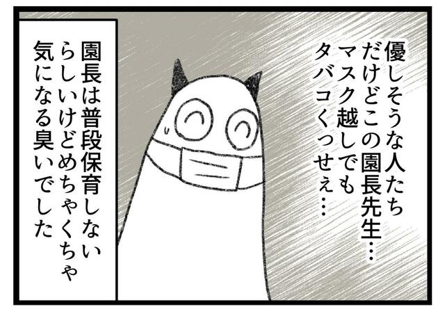 事前説明に伺った際に園長先生と担任の先生が色々と説明してくださったのですが、男性の園長先生がめっちゃくちゃにタバコ臭い…!!!