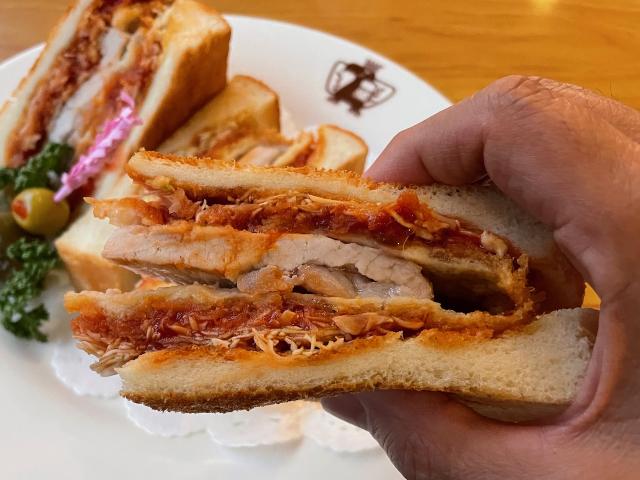 分厚いパンも心地よい。ポークカツに負けない歯ごたえ。食感も齧る際に発する音も豊かこの上ない。