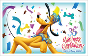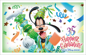 35周年コスチュームのミッキー、ミニー、ドナルド、デイジー、グーフィー、チップとデール、プルートがそれぞれ描かれた券面で登場。