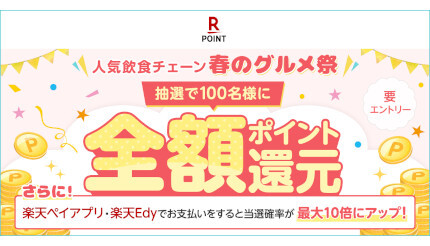 楽天ペイメントは3月15日~4月15日23時59分の期間、共通ポイントサービス「楽天ポイントカード」において、飲食に関連する加盟店が参画する「人気飲食チェーン春のグルメ祭り 抽選で全額ポイントバックキャンペーン」を実施する。