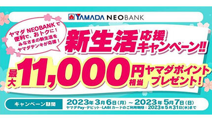ヤマダホールディングスは3月6日~5月7日の期間、ヤマダデンキを通じて提供している「ヤマダNEOBANK」をより知ってもらうべく、「新生活応援キャンペーン」を実施する。