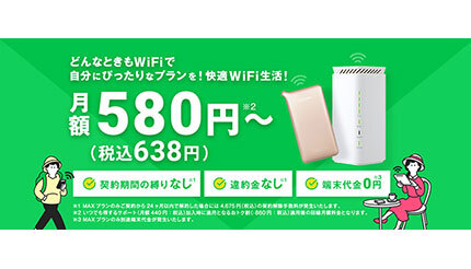 グッド・ラックは、自社が運営するサービス「どんなときもWiFi」を3月16日に再始動した。月額638円からの料金プランで、ユーザーの生活スタイルに合わせて利用することができる。