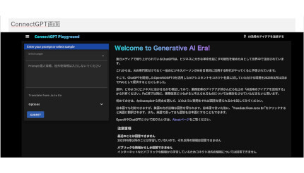 開発したサービスのユーザーインターフェースには、使用に際しての注意喚起を明記するとともに、英語で質問した方がより精度の高い回答が得られることから、自動翻訳機能も搭載し、日本語で入力した質問を英語に変換してAIに質問することが可能なほか、英語で得た回答を日本語に翻訳することもできる。