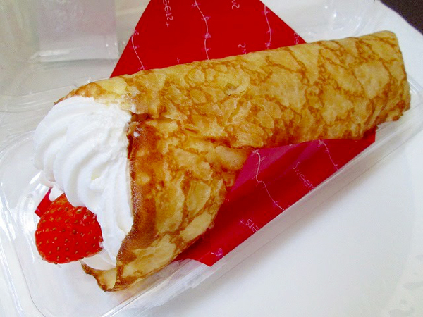 たっぷりのホイップクリームにいちごソースを包んだクレープ。