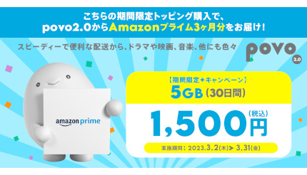 KDDIと沖縄セルラーは、オンライン専用ブランド「povo2.0」において3カ月分のAmazonプライムギフトコード付きの期間限定トッピングを提供している。提供期間は3月1日~3月31日23時59分。