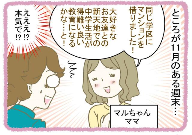 「一緒の中学に行きたい」というマルちゃんの希望は子どもならではのたわごとかと、私はもちろん、娘もそう思って期待しないよう努力していたみたいですが…ご両親ぐるみのまさかの展開。お金持ちの財力と行動力にビックリ…!