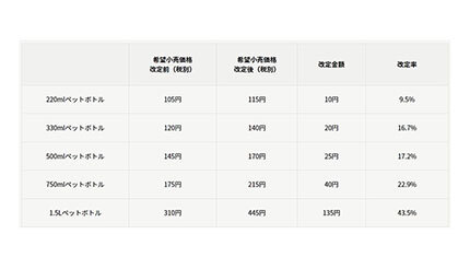 220mlペットボトルが10円増、1.5Lペットボトルが135円増など、値上げ幅は10~135円。輸入時の物流費や採水地でのエネルギー費・人件費・資材費の高騰といったコストの上昇が続いていることから、価格改定に踏み切った。