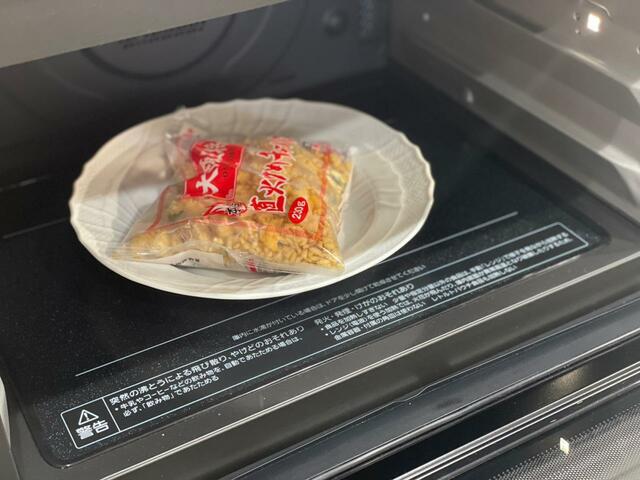 袋に穴を開けたら、そのまま耐熱皿に載せ、600Wで4分加熱しました。