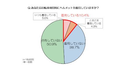 au損害保険は3月22日に、全国の自転車を利用する男女を対象に実施した、自転車利用時のヘルメットに関する調査の結果を発表した。同調査は、15~69歳の自転車を利用する男女に対して、1月11日~13日の期間に行われ、1万6635名から回答を得ている。