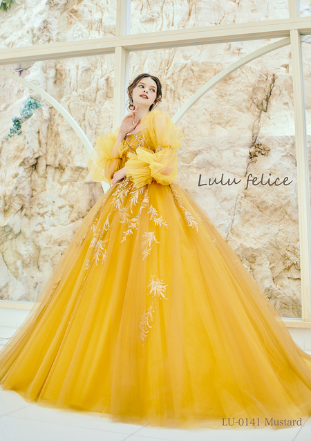 このドレスのために作られた、こだわりのテラコッタカラーと、映画『美女と野獣』のベルのような、華やかマスタードイエロー、どちらも選べない可愛さ!