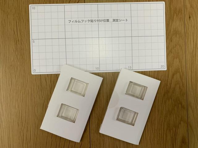 左右のフィルムフックの貼り付け位置の確認には、付属の測定シートが役立ちます。