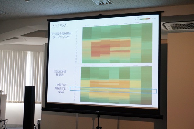 計測データを見ると空気清浄機を設置することで、14時〜15時、お昼寝やおやつといった子どもたちの動きが少ない時間帯には、空気の質が向上しています。