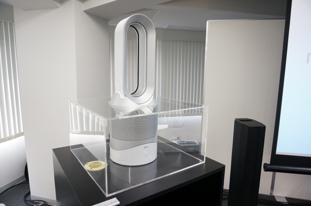 最後に清浄能力デモとして、空気清浄機に送風機にファンヒーター機能も備えたオールシーズン対応モデル「Dyson Pure Hot+Cool Link」のデモンストレーションが行なわれました。