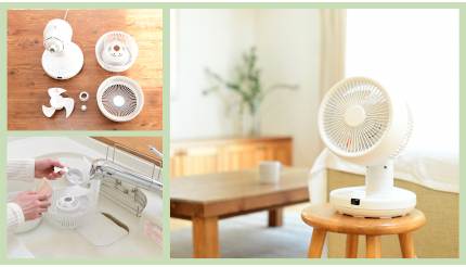 「洗えるサーキュレーター」シリーズは、工具を使用することなく簡単に分解・組み立てが可能なので、ホコリのつきやすい前面ガードや羽根、背面ガードを水で丸洗いでき、常に清潔な状態に保てる。今回、発売される新機種では、部品の取り外し方法を一部見直すことによって、分解・組み立てをさらに容易にした。