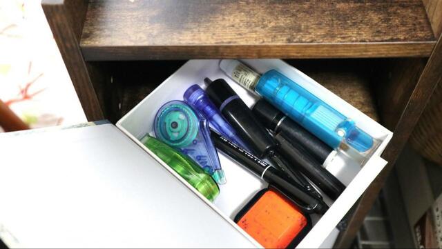 ブック型収納ボックスには、ペンや修正テープなどの文具、印鑑や朱肉を入れておくことにしました。これで書類作業にもすぐに取りかかれそうです。