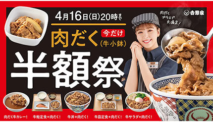吉野家は4月3日11時から4月16日20時まで、全国の吉野家店舗で「肉だく(牛小鉢)」を半額で提供するキャンペーン「肉だく半額祭」を実施する。