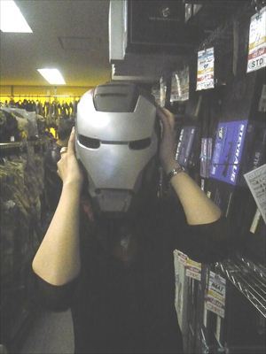 ふと、ケースの中にひと際“異質なモノ”が!「…これもゲームで使うんですか?」と尋ねる松宮。“異質なモノ”の正体はヘルメットマスクの「IRON-MAN3(7000円)」。許可を得て、かぶらせていただくと…ほとんど何も見えない。