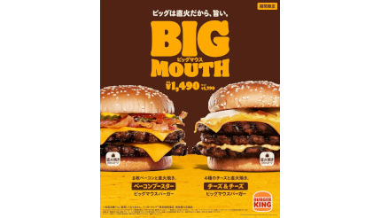 バーガーキングから3月31日から期間限定で、直火焼きの100%ビーフパティを使用した「ベーコンブースター ビッグマウスバーガー」「チーズ&チーズ ビッグマウスバーガー」が発売となる。価格は、どちらも単品で1490円、セットで1790円。