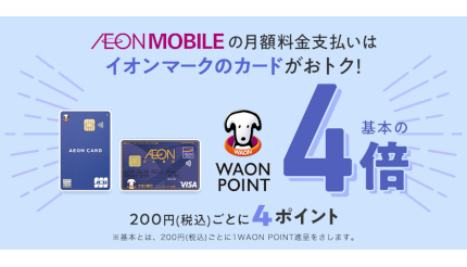 イオンリテールは、同社の提供するMVNOサービス「イオンモバイル」において、月額料金をイオンマークのカードで支払う場合に利用料金に応じて付与する「WAON POINT」を、4月利用分から従来の2倍となる税込200円あたり4ポイントに増量する。