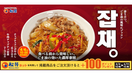 松屋フーズは、牛めし・カレー・定食・その他丼の「松屋」で「チャプチェコンボ牛めし」と「牛肉チャプチェ定食」を4月4日10時から発売する。価格は、チャプチェコンボ牛めしが630円、牛肉チャプチェ定食の普通盛りが730円、ダブルが1130円。