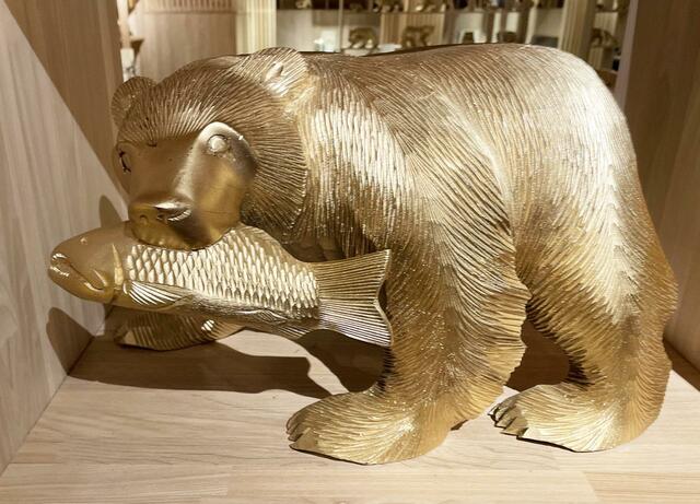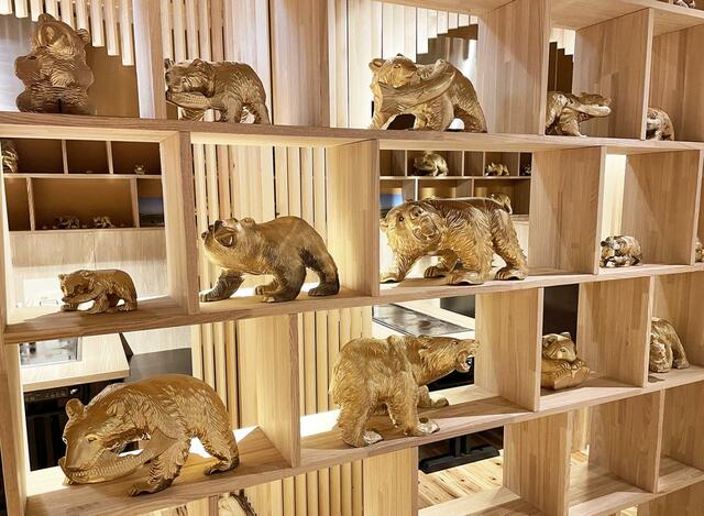 店舗があるフロアまでエレベータで上がると、入口に金色に塗られた木堀りの熊たちがお出迎え。