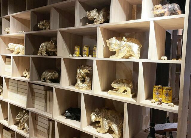 驚きと合わせて「よくこれだけの木彫りの熊を集めたもんだ」と感心しますが、お店の方によると、開業前に一般募集した「クマファンディング」で提供されたものと、取引先や社員が寄せたものが並んでいるのだそう。