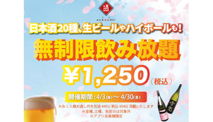 クリエイティブプレイスは4月3~30日の期間、同社の運営する「日本酒原価酒蔵」全店舗で1250円からの時間無制限飲み放題を、日曜~木曜に1日30人限定で開催する(金曜、土曜、祝前日は対象外)。