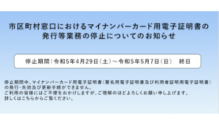 4月29日~5月7日の期間、市区町村窓口におけるマイナンバーカード用電子証明書の発行などを停止