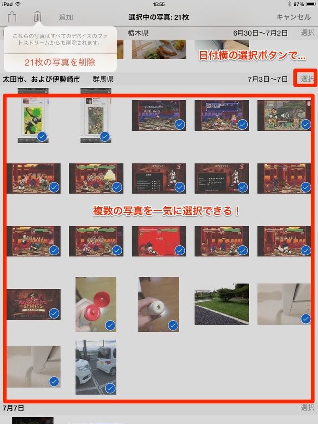 iPadでは、写真をタップして選択した後ドラッグして複数の写真を選択する。というテクニックがありましたが、iOS 7ではそれらは使えなくなってしまっているようです。