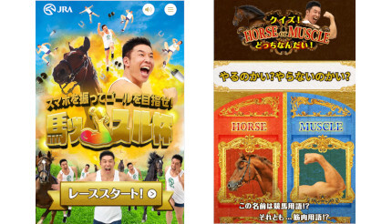 あわせて公開されている「クイズ!HORSE or MUSCLE どっちなんだい!」では、競馬関連用語と筋肉関連用語のどちらなのかを時間内に当てる、意外と難易度の高いクイズコンテンツ。