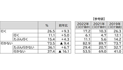 ゴールデンウィーク期間中の、帰省を含めた旅行意向を尋ねたところ、「行く」と「たぶん行く」を合わせた割合は26.5%で、前年より9.3ポイント増加している。新型コロナ禍前の2019年の調査結果は26.3%だったので、旅行意欲は新型コロナ禍前と同等まで回復したといえる。