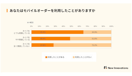 New Innovationsは4月6日に、東京都に在住する20~50代の男女400名を対象に実施した、「タイパとモバイルオーダーに関するアンケート」の結果を発表した。同調査は、2月21日に行われている。