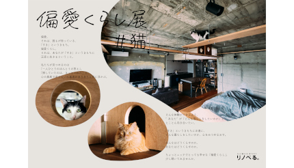 リノベるは4月8日(本日)、リアル展示イベント「偏愛くらし展#猫 byリノベる。」を、リノベる表参道オフィスと併設のショールーム(東京都港区)で開催する。あわせて、ウェブコンテンツやYouTubeなどにおいて、「偏愛くらし」をテーマにした発信を行っていく。