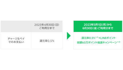 代わりに5月1日~6月30日の期間は、「LINE Pay請求書払い」を除く「チャージ&ペイ」での支払いに対するLINEポイント0.5%還元と、「LINEポイント総額60万ポイント抽選キャンペーン」を実施する。「チャージ&ペイ」の店頭決済については、実質的に6月30日までは現状と変わりはない。