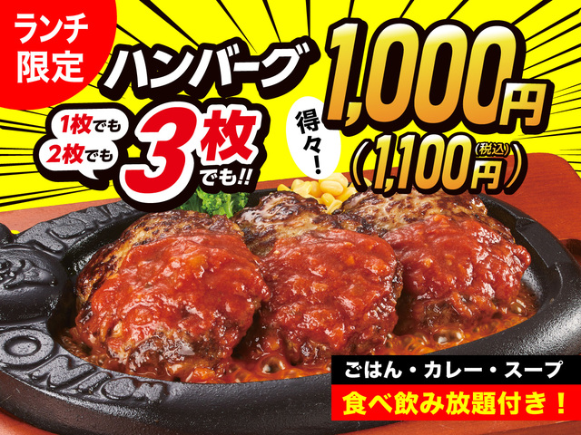 ハンバーグ3枚まで同一金額!?さらにカレー食べ放題も!