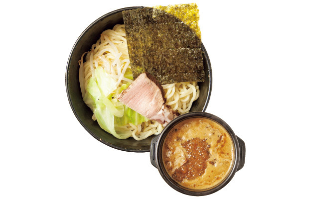 <麺屋 八兵衛発>石鍋でグツグツと音を立ててつけダレが運ばれてくる「石鍋醤油つけめん」はインパクト大。カツオの厚削りなどの乾物とトンコツ、鶏ガラなどの動物系からとったスープは風味も豊か。