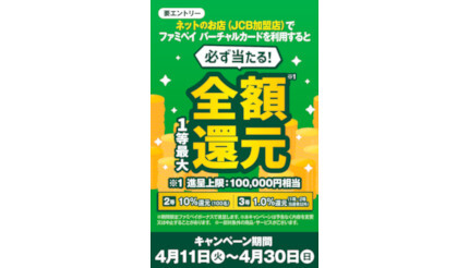 エントリーのうえ、4月11日~30日23時59分のキャンペーン期間中にJCB加盟店でのファミペイのバーチャルカード/Google Payで支払うと、1等(10人)なら期間中のファミペイ バーチャルカード利用金額の全額(最大10万円)、2等(100人)なら同利用金額の10%、3等(1等・2等当選者以外の全員)なら同利用金額の1%を期間限定ファミペイボーナスで還元する。