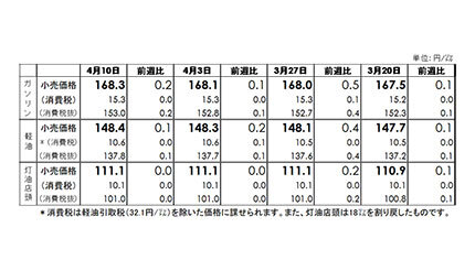 ガソリン価格の値上がりが続いている。資源エネルギー庁の調査によれば、ガソリンの店頭現金小売価格は4月10日時点でレギュラーが1リットル当たり168.3円。前週と比べて1リットル当たり0.2円増で、4週連続の値上がりとなったという。