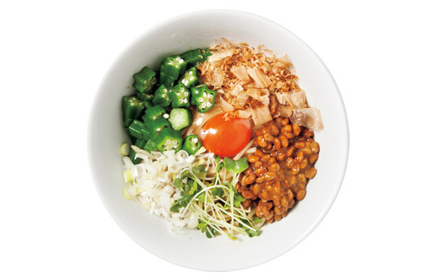 基本生たまご、納豆、おくら、ネギ、かつおぶし トッピング味玉100円、メンマ100円、のり100円