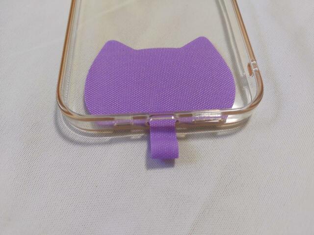 次に、スマホケースの充電口部分に猫型アタッチメントのループ部分を通していきます。