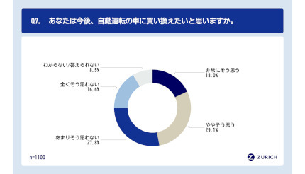 チューリッヒ保険会社は4月12日に特定の条件下でシステムが運転を行う自動運転「レベル4」の運行許可制度を盛り込んだ改正道路交通法が、4月に施行されることを受けて、自動車保険に加入しており、週に5日以上運転する人を対象に実施した、「自動運転」に関する意識調査の結果を発表した。同調査は、2月7日~16日の期間に行われ、1100名から有効回答を得ている。