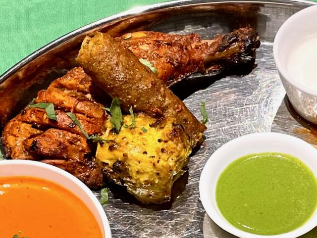 【インド宮廷料理 マシャール】タンドリーランチのタンドリーチキン、フィッシュティッカ、シークカハーブ。右下がグリーンチャトニ